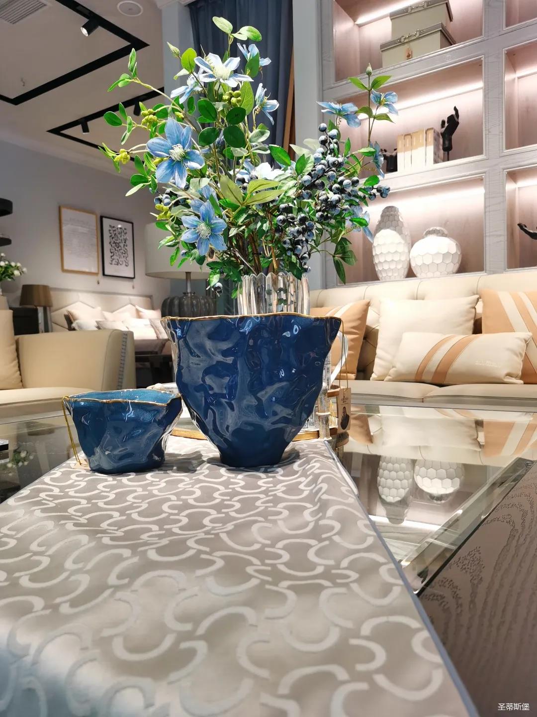 中国传统陶瓷艺术,尤见装饰匠心。表面凹凸,深浅海蓝交错,倒映出海面迎风起波的场景,深邃沉静。
